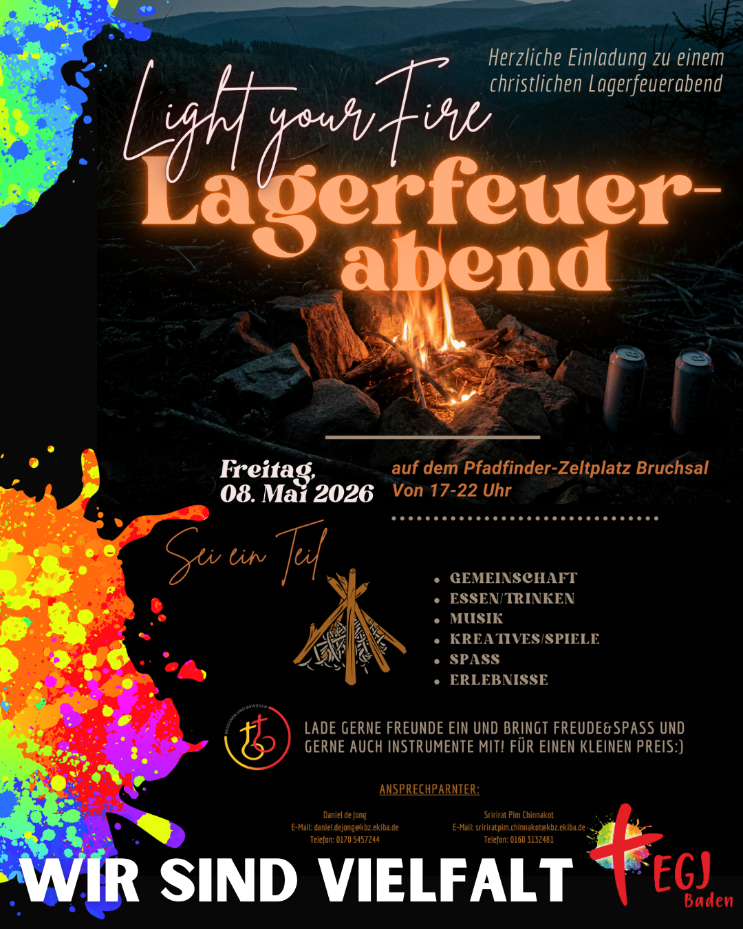 Der Leitungskreis des Jugendwerk lädt am 8.5.26 zu einem gemütlichen Abend an mehreren Lagerfeuern auf dem Zeltplatz der Pfadfinder Bruchsal ein. Nähere Infos auf dem Flyer.